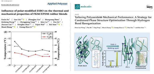 在高耐受聚合物基复合材料的微观结构设计领域,李光照副研究员创新性地开发了环氧大豆油基增塑剂,显著改善了氟橡胶与三元乙丙橡胶共混体系的低温性能。实验结果显示,该增塑剂最高可使复合橡胶的玻璃化转变温度(Tg)降低3.54℃,相关成果发表于《Journal of Applied Polymer Science》期刊(图4左)。王文燕博士则聚焦于尼龙66的凝聚态结构调控,创新性地在熔融纺丝过程中引入芳酰胺材料TMB-5,并利用二者相似的化学结构调控体系内分子间氢键网络,从而实现凝聚态结构的定向优化。该工作从加工过程中的分子间动态作用层面深化了对聚合物结构‑性能关系的理解,为发展高性能工程聚合物及纤维材料提供了有潜力的加工调控途径,相关成果已在《Molecules》期刊正式发表。(图4右)
