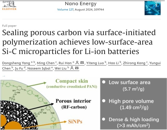 在新能源领域,韩锐教授针对硅碳负极中体积膨胀大的严峻挑战,提出通过絮凝沉淀、热压实、喷雾干燥、表面引发聚合等过程,将导电交联聚苯胺(c-PANi)在多孔硅碳颗粒上的均匀附着。该方法制备的双包覆层Si-C颗粒(Si@RFC-cPANi)具有低比表面积(5.7 m2/g)、丰富的闭孔结构(1.49 cm3/g),并且在NCM622体系全电池中表现出优异的电化学特性,其能量密度可达445 Wh/Kg(图5),相关成果发表于《Nano Energy》期刊。