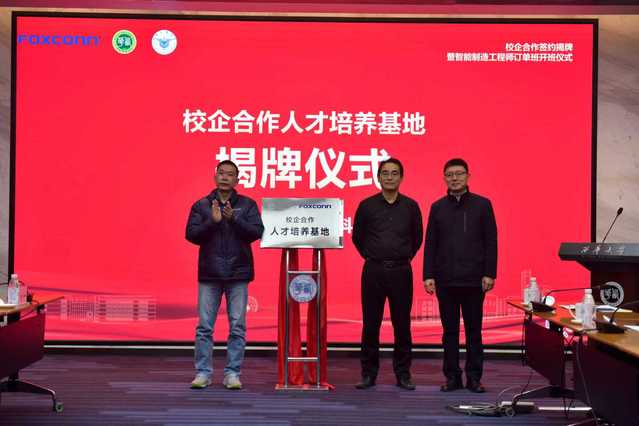 随后,费凌、张勤勇与张荣共同揭牌,确认富士康科技集团为“校企合作人才培养基地”。