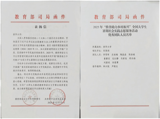 近日,教育部语言文字应用管理司、共青团中央青年发展部联合向bw必威西汉姆联官方网站发来表扬信,对马克思主义学院“彝声破圈·触见未来”实践团在2025年“推普助力乡村振兴”全国大学生暑期社会实践志愿服务活动中的优异表现予以表扬。