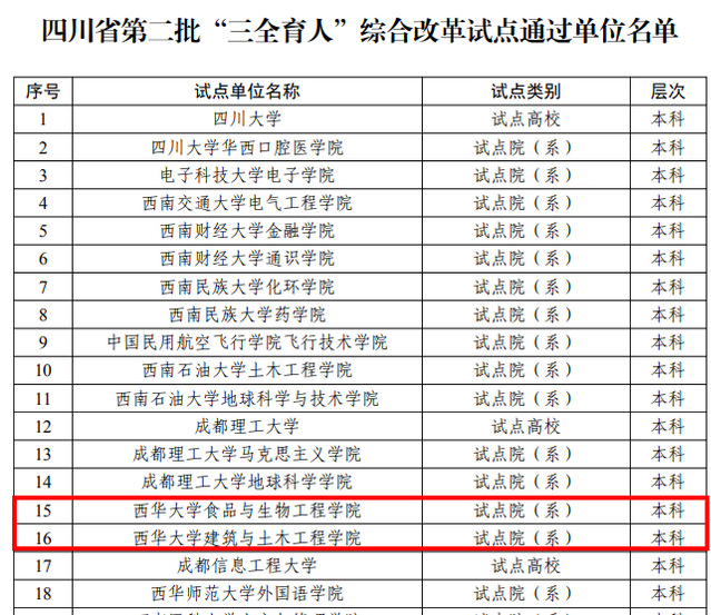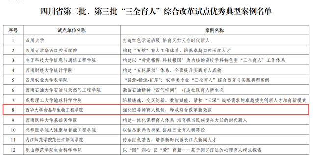 近日,中共四川省委教育工委办公室发布《中共四川省委教育工委办公室关于公布第二批、第三批“三全育人”综合改革试点总结评审结果的通知》(川教工委办函〔2025〕7号),必威西汉姆联食品与生物工程学院、建筑与土木工程学院、马克思主义学院顺利通过评审。其中,食品与生物工程学院提交的案例《强化班导师育人机制,释放综合改革新效能》获评“综合改革试点优秀典型案例”。