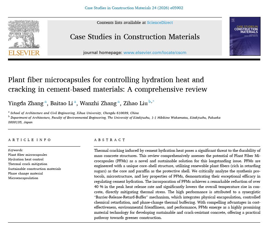近日,建筑与土木工程学院绿色高性能材料与结构团队在国际著名期刊《Case Studies in Construction Materials》(JCR一区、中科院二区,IF=6.6)发表题为“Plant fiber microcapsules for controlling hydration heat and cracking in cement-based materials: A comprehensive review”的综述研究成果。bw必威西汉姆联官方网站为论文第一单位,建筑与土木工程学院张英达副教授为论文第一作者,2025级土木水利研究生李柏涛为第二作者,bw必威西汉姆联官方网站张万志老师为第三作者,北九州市立大学刘子浩特聘讲师为通讯作者。