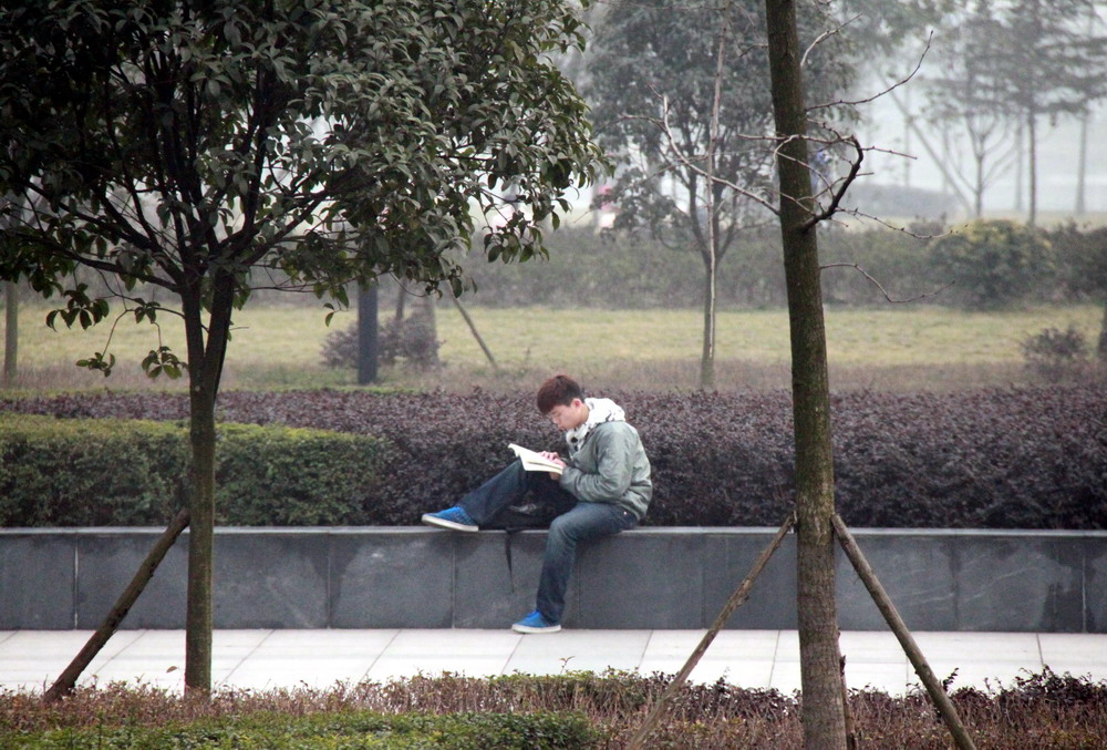 恣意地坐在花台上, 无论在哪里都可以和心爱的书有个“约会”。