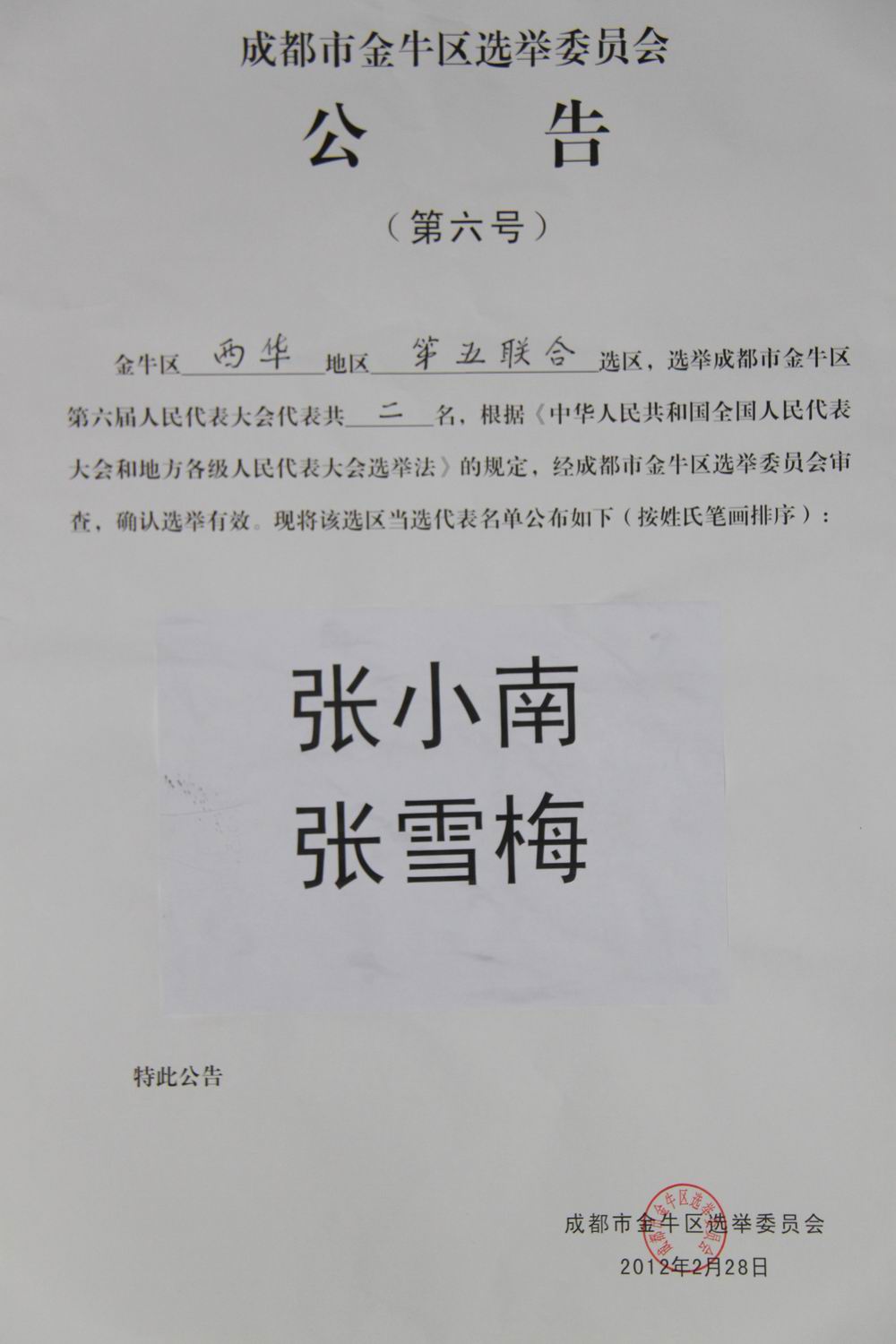 2月27日,由bw必威西汉姆联官方网站及bw必威西汉姆联官方网站社区居委会组成“西华地区第五联合选区”的3万余名选民,在1个选举大会主会场和27个投票站参加了金牛区第六届人大代表选举投票。 经统计选票并报成都市金牛区选举委员会审核,确认该选区选举有效,必威西汉姆联党委书记张小南、人文学院副教授张雪梅当选为金牛区第六届人大代表。成都市金牛区选举委员会于2月28日对本选区选举结果作了张榜公告。