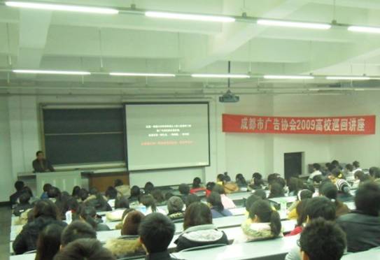 近日,成都市广告协会2009年高校巡回讲座在6B-107举行。讲座由成都市飞扬广告设计公司总经理杨帆主讲。艺术学院副院长屈立丰及部分老师、同学聆听了此次讲座。