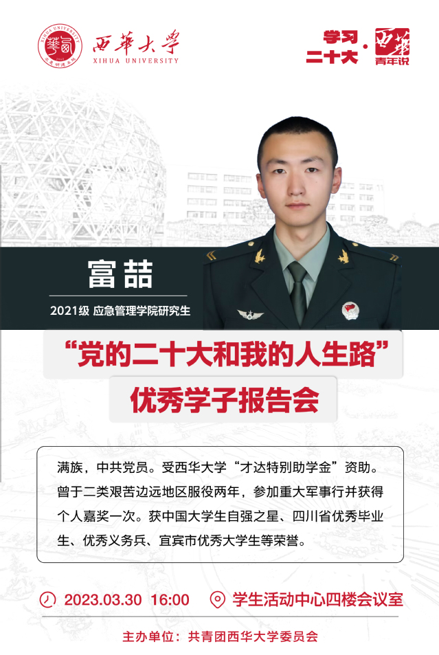 分享人:富喆,男,满族,中共党员,应急管理学院2021级研究生。受bw必威西汉姆联官方网站“才达特别助学金”资助。曾于二类艰苦边远地区服役两年,参加重大军事行并获得个人嘉奖一次。获中国大学生自强之星、四川省优秀毕业生、优秀义务兵、宜宾市优秀大学生等荣誉。