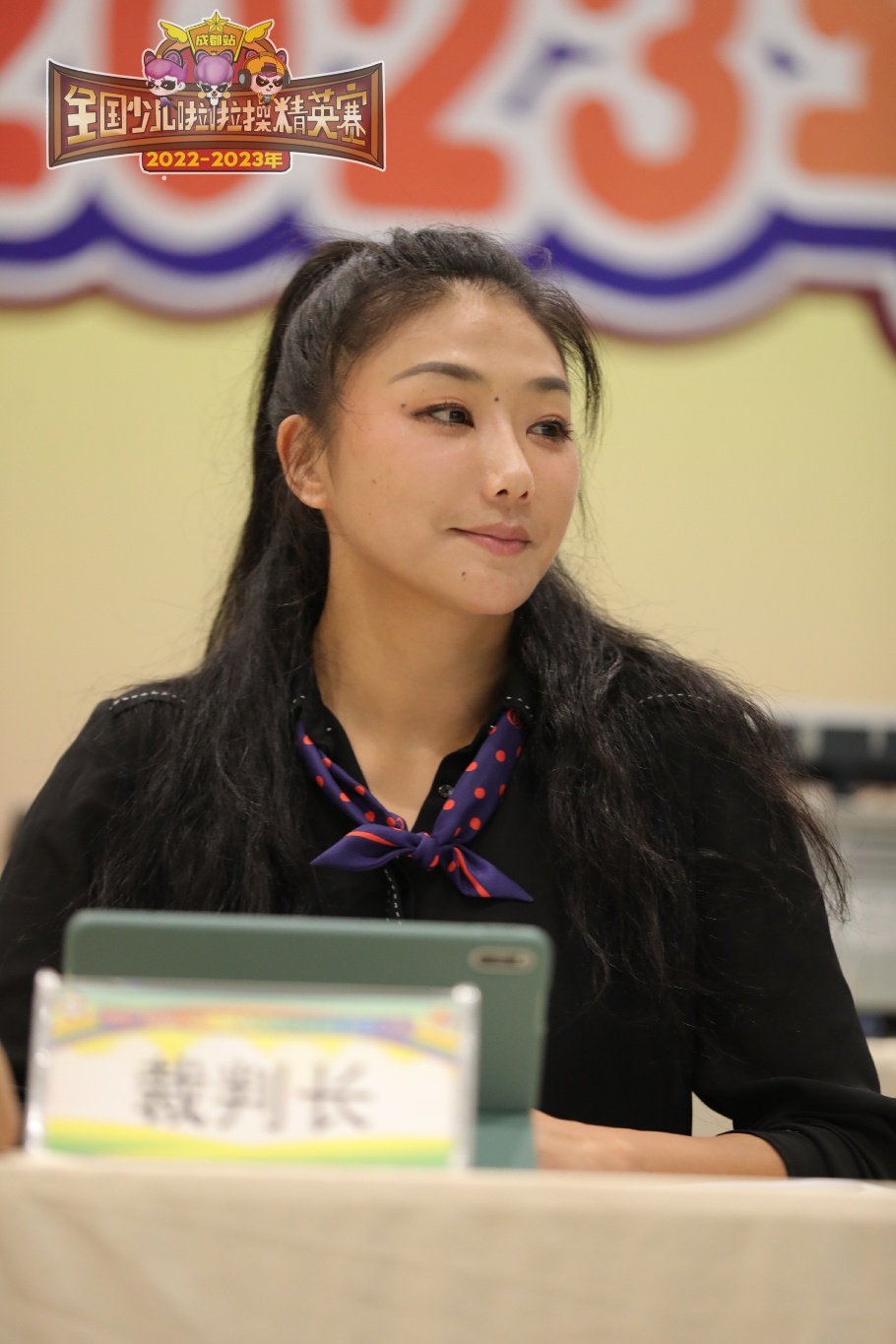 张讴在担任全国少儿啦啦操精英赛的裁判工作。