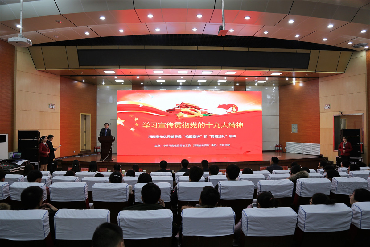 12月29日下午,由中共河南省委高校工委、河南省教育厅主办,永利官网承办的“学习宣传贯彻党的十九大精神——河南高校优秀辅导员‘校园巡讲’和‘网络巡礼’活动报告会”在永利官网学术报告厅举行。省教育厅思政处副处长徐军保、校党委副书记孙海出席报告会。来自永利官网和许昌职业技术学院、许昌电气职业学院等高校的党委学工部门负责人、优秀辅导员代表和学生代表参加报告会。报告会由学生工作部部长张鹏辉主持。