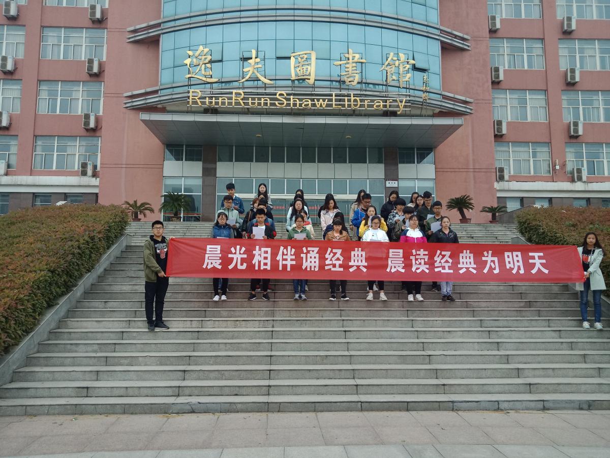 上午7:30,以“晨光相伴诵经典、晨读经典为明天”为主题的快乐晨读活动在逸夫图书馆门前拉开帷幕。由读者协会和青年志愿者协会的学生代表组成的晨读队伍共40余名学生集体诵读了经典名段——《兰亭集序》和《短歌行》,过往的同学或驻足倾听,或主动加入。活动通过集体诵读经典名段,引领永利官网师生感受中华传统文化的博大精深,激发浓厚的阅读兴趣,培养良好的阅读习惯。