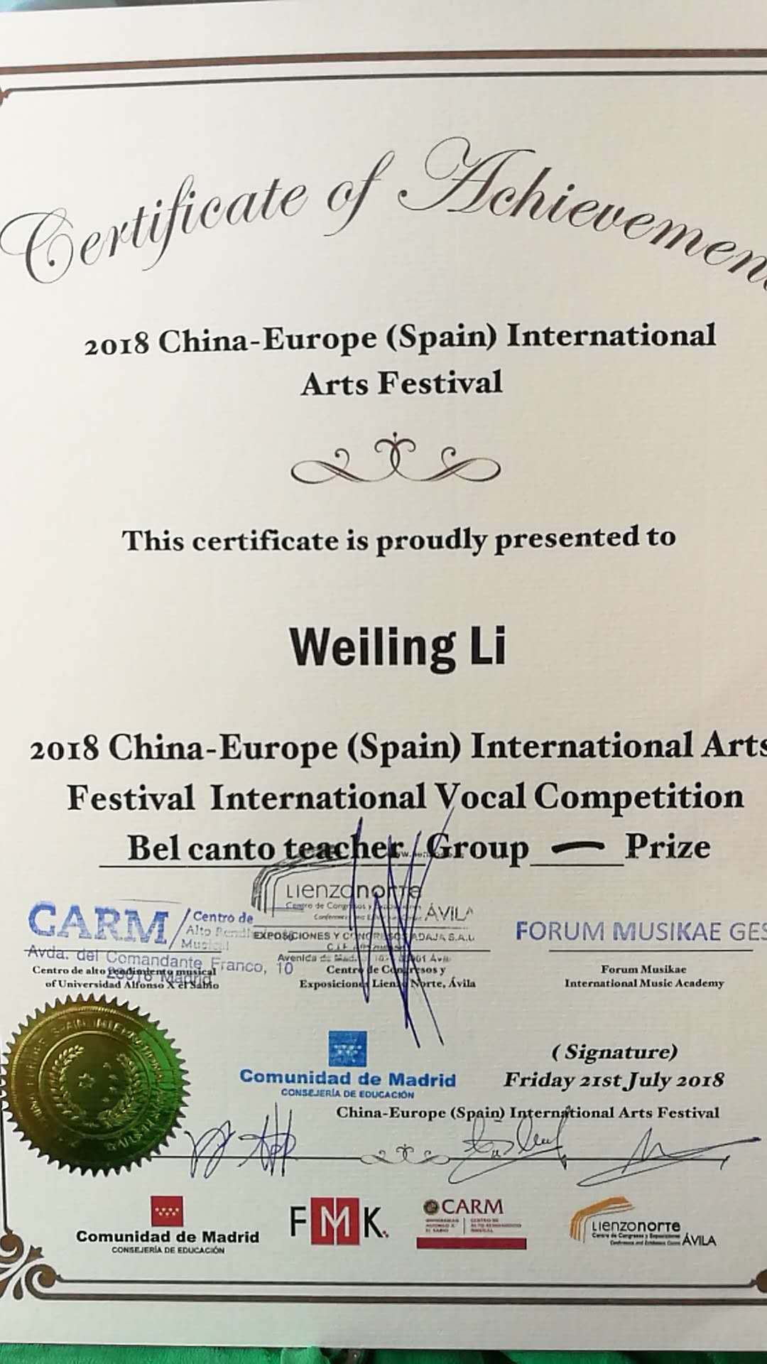 为庆祝中西建交45周年,由西班牙驻华大使馆以及中国驻西班牙大使馆大力支持,西班牙马德里大区政府、西班牙马德里大区文化教育部、西班牙阿维拉北利恩索艺术中心联合主办的2018中欧艺术节国际声乐比赛于7月16日-26日在西班牙首都马德里举行。永利官网青年教师李卫玲荣获该赛事美声教师组第一名。