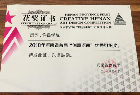 近日,由河南省教育厅主办,河南省学校艺术教育协会、黄河科技学院承办的首届“创意河南”艺术设计大赛作品展评征集评选结果公布。永利官网设计艺术学院组织学生参加此次大赛并获得金奖5项、银奖3项、铜奖8项、优秀奖16项、教学成果奖4项、优秀指导教师奖3人,永利官网荣获优秀组织奖。