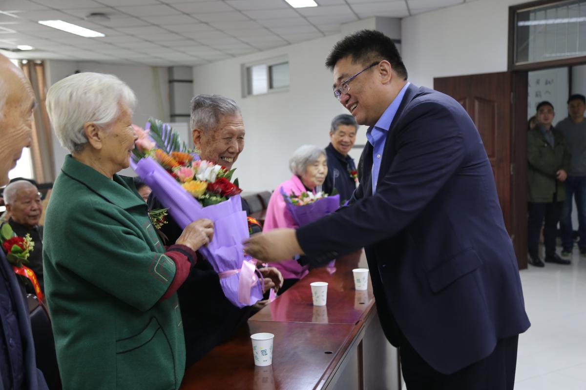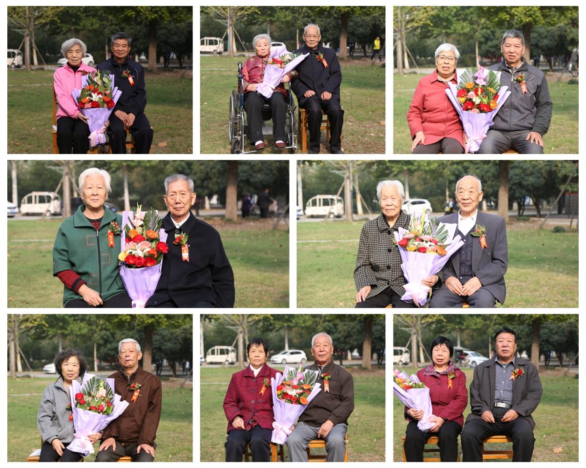 在茶话会暨金婚钻石婚庆典上,校工会主席高金星代表全校教职工致辞,组织部长陈遂德宣读了金婚、钻石婚伉俪名单,离退休老同志和金婚钻石婚伉俪代表李俊川作了发言,校领导向金婚、钻石婚伉俪敬献了鲜花。(摄影:袁旭阳 钟伟超)