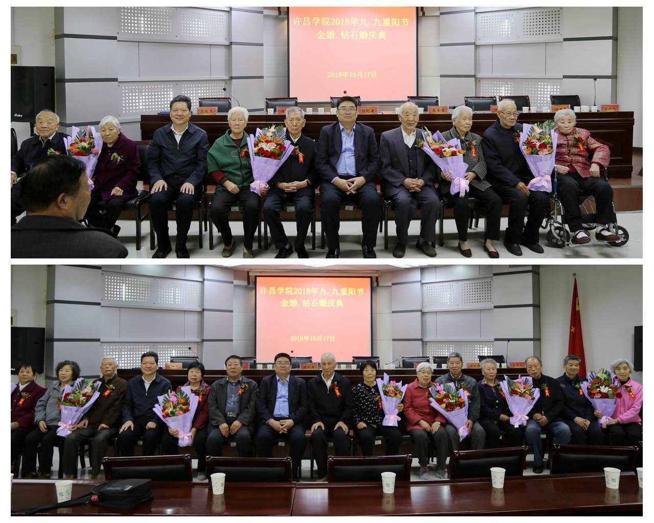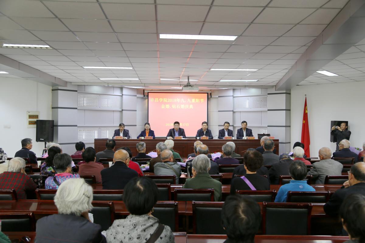 岁岁重阳,今又重阳。10月17日上午,在传统敬老节日—重阳节来临之际,永利官网在第三会议室举行了2018年“九九重阳节”茶话会暨金婚钻石婚庆典。校党委书记闫纪建、校工会主席高金星出席庆典,党政办公室、党委组织部、离退休工作处负责同志和13对金婚钻石婚伉俪、百余名离退休老同志参加庆典。茶话会和金婚钻石婚庆典由离退休工作处党总支书记马廷杰主持。