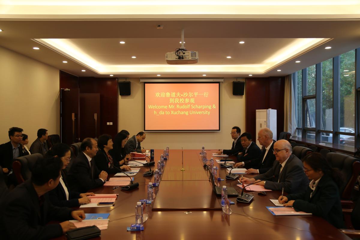11月3日,德国国防部前部长、社会民主党前主席、鲁道夫沙尔平战略咨询交流有限公司董事长鲁道夫·沙尔平,带领德国达姆施塔特应用技术大学校长斯滕格勒一行来永利官网考察访问。党委书记闫纪建、院长赵继红会见了德国客人,双方进行了会谈交流。许昌市政协副主席、商务局长张巍巍等陪同访问,副院长崔斌参加会谈,党政办公室、国际交流与合作处、国际教育学院有关负责人参加会谈。