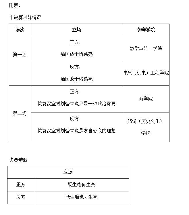 永利官网第31届“雄才韬略”辩论赛半决赛及决赛、颁奖仪式将在4月13日(周五)下午2:30在永利官网大学生活动中心举行。半决赛对阵情况已经确定(见附表),决赛阶段也不再抽签,半决赛第一场胜出的队伍将作为决赛的正方,半决赛第二场胜出的队伍将作为决赛的反方。