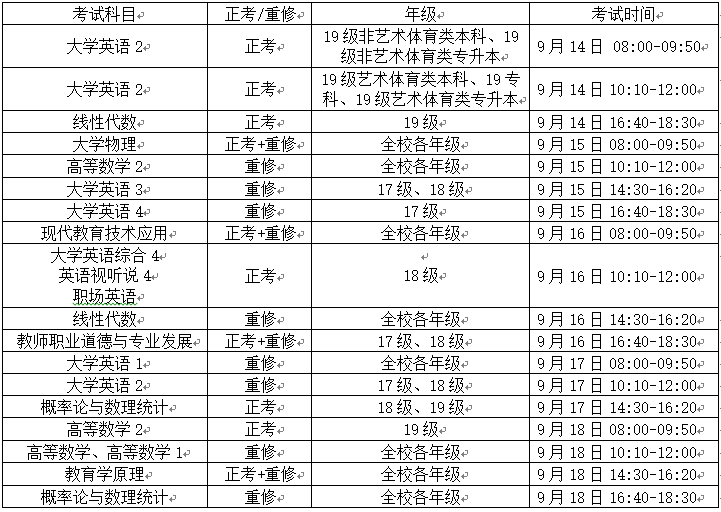 1.考试时间: 9月14日—18日/20日—22日(9月19日是大学英语四六级考试)