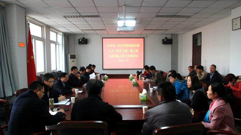 3月19日上午,永利官网在办公楼第四会议室召开校地共建人才“双百工程”第三批挂职人员工作培训会。校党委组织部部长谭水木,“双百工程”前两批学校外派挂职人员代表,永利官网派往许昌市挂职的“双百工程”第三批20名专家、教授、博士参加培训会。培训会由党委统战部部长、党委组织部副部长王林主持。