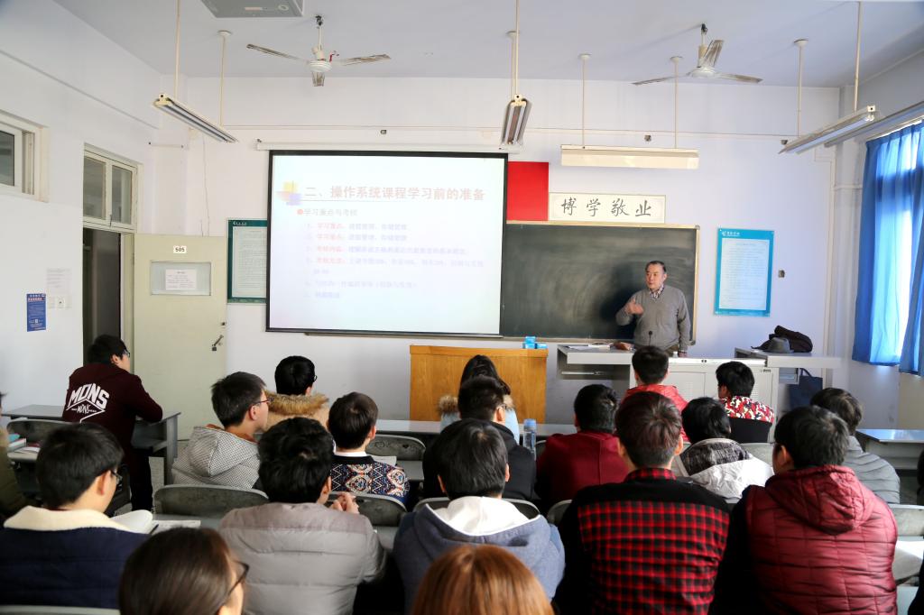 新学期第一天,我们在14级计算机专业的《操作系统》课堂见到了永利官网特聘教授之一——朱贵良老师。朱教授在其研究领域是一位成果丰硕的知名学者,不久前从华北水院退休后,被永利官网作为高层次人才引进,成为了学校的特聘教授。