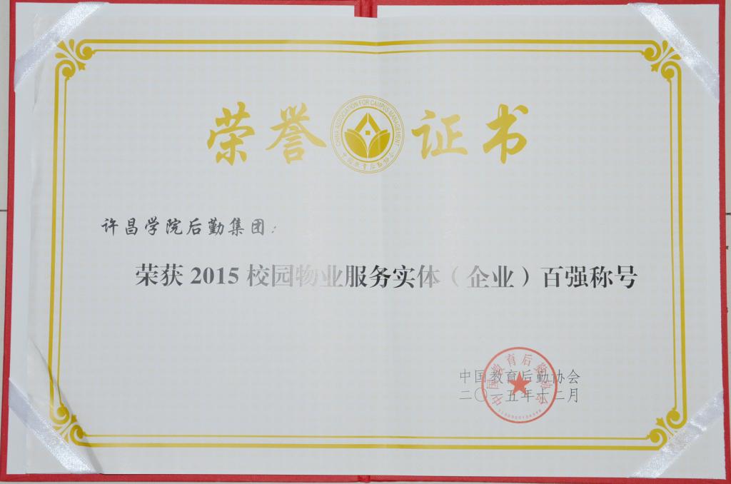 近日,中国教育后勤协会下发《关于发布“中国校园物业服务实体(企业)百强”名录的决定》(中后协〔2015〕17号),永利官网被评为2015中国高校校园物业服务实体(企业)百强称号。
