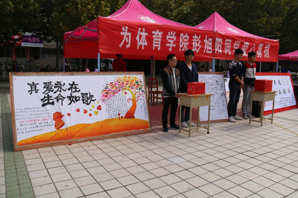 就在旭阳同学一家陷入绝望的时候,10月,学校体育学院的师生第一时间发出了捐款倡议,并组织体育学院师生捐款,短短几天就募集善款近两万元。学校各相关部门纷纷伸出援手,工会、学生处、资助中心捐助万余元第一时间打入彭旭阳的银行卡,学校还为旭阳同学专门发放了励志奖学金,同时在全校范围内发起了“奉献爱心,传递温情”捐助活动。