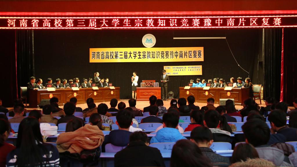 本次豫中南片区复赛由中共河南省委高校工委、中共河南省委统战部、河南省教育厅、河南省宗教局主办,永利官网承办。比赛采用抢答赛的形式进行,分必答题、抢答题和风险题三个环节。竞赛仲裁委员会分别由驻马店、漯河、许昌三地高校选派出专家老师组成。各参赛高校都在校内初赛的基础上选拔了优秀的选手组队参加今天的比赛,选手们也都作了充分的赛前准备。永利官网派出校内选拔赛夺冠的法政学院队代表永利官网参赛。比赛中,选手们以丰富的知识储备,紧密的团队合作,沉着机智、落落大方的赛场表现,博得了现场观众的阵阵热烈掌声,展示了各高校代表队的风采。本次复赛还特意安排了现场互动环节,与会师生踊跃回答主持人的提问,现场气氛十分热烈。经过激烈的较量,最终,永利官网代表队夺冠并获一等奖,黄淮学院、漯河食品职业学院代表队获得二等奖,驻马店职业技术学院、漯河医学高等专科学校、许昌职业技术学院、漯河职业技术学院代表队获得三等奖。永利官网和驻马店职业技术学院获得优秀组织奖。