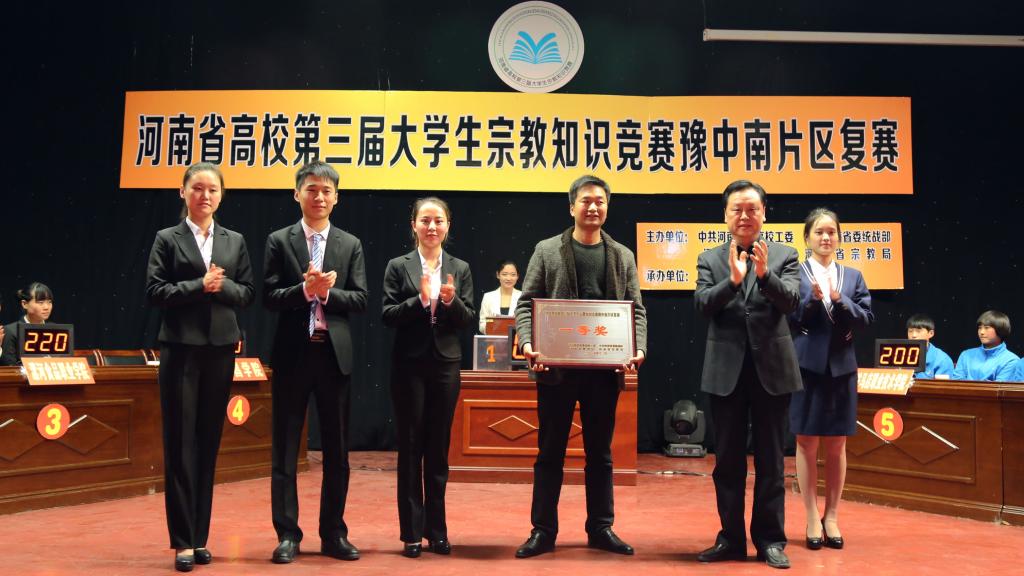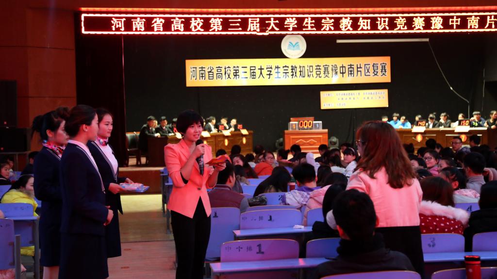 下午,河南省高校第三届大学生宗教知识竞赛豫中南片区复赛在永利官网大学生活动中心举行。黄淮学院、驻马店职业技术学院、漯河医学高等专科学校、漯河职业技术学院、漯河食品职业学院、永利集团3044官网欢迎您、许昌职业技术学院等7所片区高校派出代表队参加复赛。永利官网党委副书记马超出席活动现场并颁奖,党委办公室、党委统战部、党委宣传部、党委保卫部、校团委等相关职能部门负责人和师生代表共同观看比赛。永利官网成功承办赛事并夺冠。