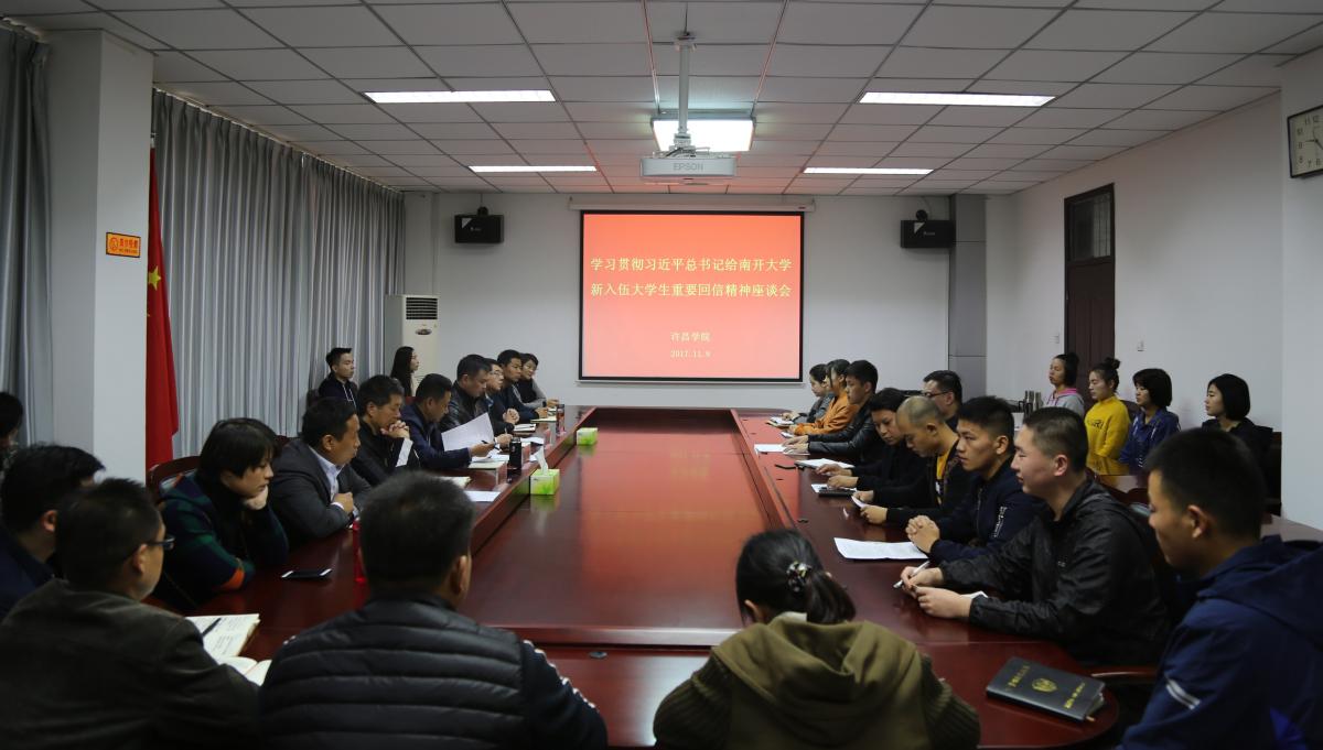 11月9日上午,永利官网在办公楼第四会议室召开了学习贯彻习近平总书记给南开大学新生入伍大学生重要回信精神座谈会。校党委副书记孙海出席会议,党委宣传部、学生工作部和武装部等相关部门负责人、各二级学院学生工作负责人代表和全体退伍学生共50余人参加座谈。座谈会由学生工作部部长张鹏辉主持。