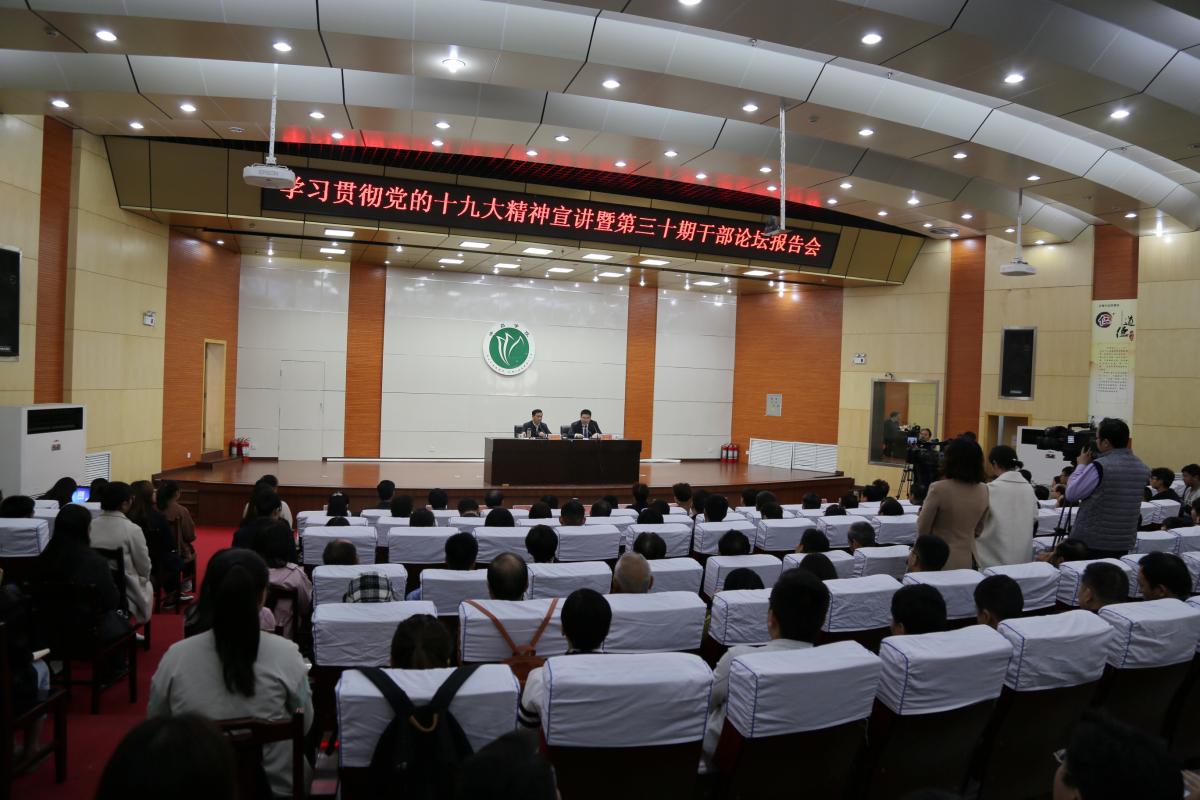 11月10日,十九大代表、许昌市委书记武国定做客永利官网第三十期干部论坛,向广大师生宣讲党的十九大精神。市委常委、市委秘书长王志宏,副市长赵淑红等出席报告会,永利官网党委书记闫纪建、院长赵继红等全体校级领导干部、全体中层干部,博士、教授、学生代表聆听了武国定书记的精彩报告。报告会由校党委书记闫纪建主持。