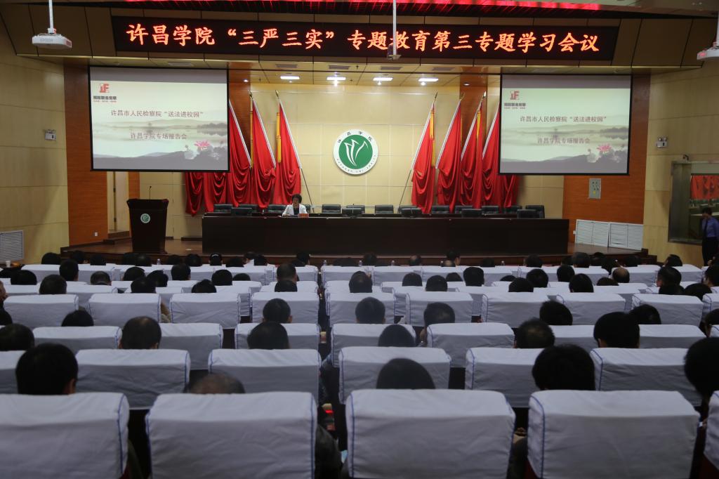 10月21日下午,永利官网在学术报告厅举办了“三严三实”专题教育会议,观看和听取了许昌市人民检察院带来的“预防职务犯罪,送法进校园”专场报告。许昌市人民检察院党组副书记、常务副检察长赵国亮、许昌市人民检察院职务犯罪预防局局长朱东旭、副局长胥欣,以及魏都区人民检察院、许昌县人民检察院预防部门的负责人等同志,全校科级以上干部共三百余人参加了报告会。报告会由校纪委书记罗凤英主持。