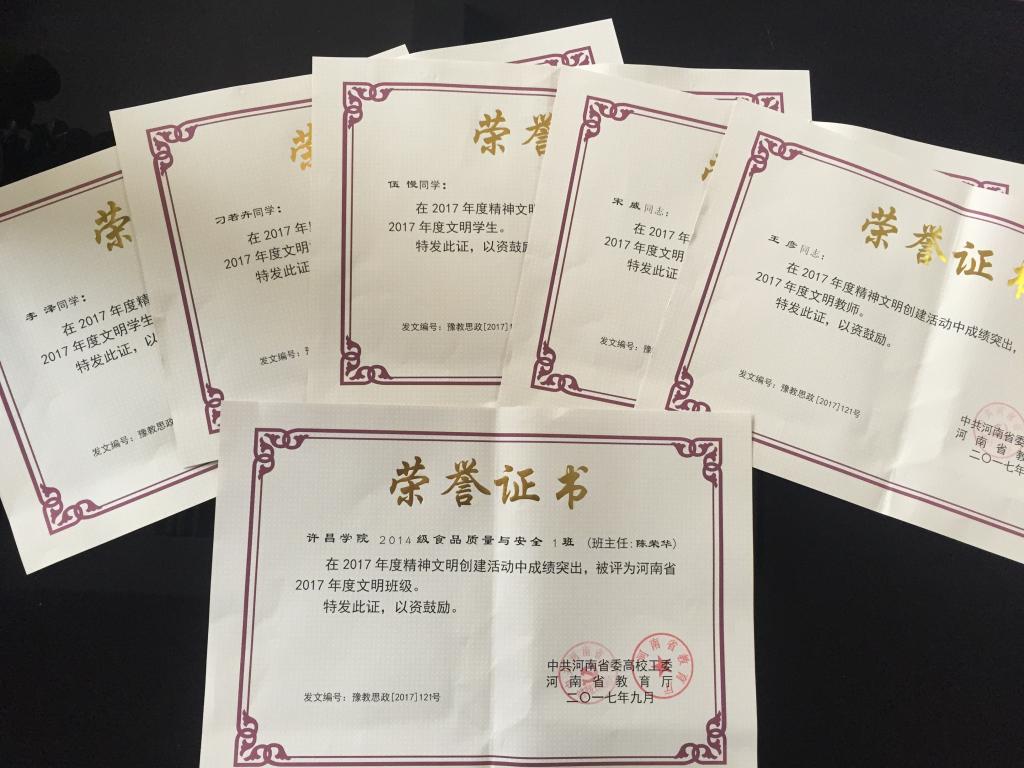 在全省教育系统2017年度精神文明建设先进集体和先进个人的评选工作中,永利官网2014级食品质量与安全1班(班主任:陈荣华)被评为“河南省2017年度文明班级”;党委宣传部王彦、美术学院国画教研室宋威两名教师被评为“河南省2017年度文明教师”;2014级工商管理(会计方向)1班李泽、2014级汉语语言文学2班刁若卉、2015级数学与应用数学1班伍慢三名同学被评为“河南省2017年度文明学生”。
