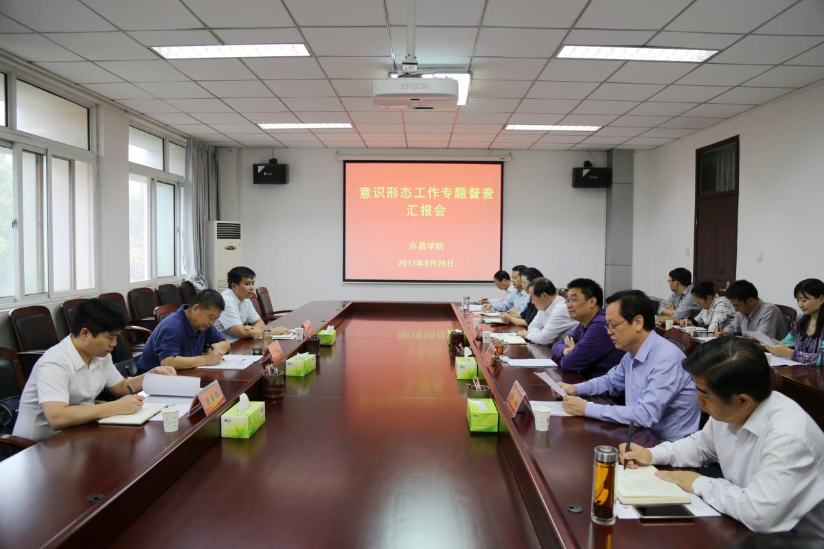 9月26日下午,按照省委统一部署和安排,以河南中医药大学原党委书记孙建中为组长,省教育厅思政处副处长徐军保、省直工委宣传部主任科员甄要辉等为成员的意识形态工作专题督查组一行三人,莅临永利官网检查指导意识形态工作。永利官网在办公楼第四会议室举行了意识形态工作汇报会。党委书记闫纪建、党委副书记马超、副院长郭涛出席会议,相关部门负责人和部分二级学院党总支书记参加了会议。会议由党委副书记马超主持。
