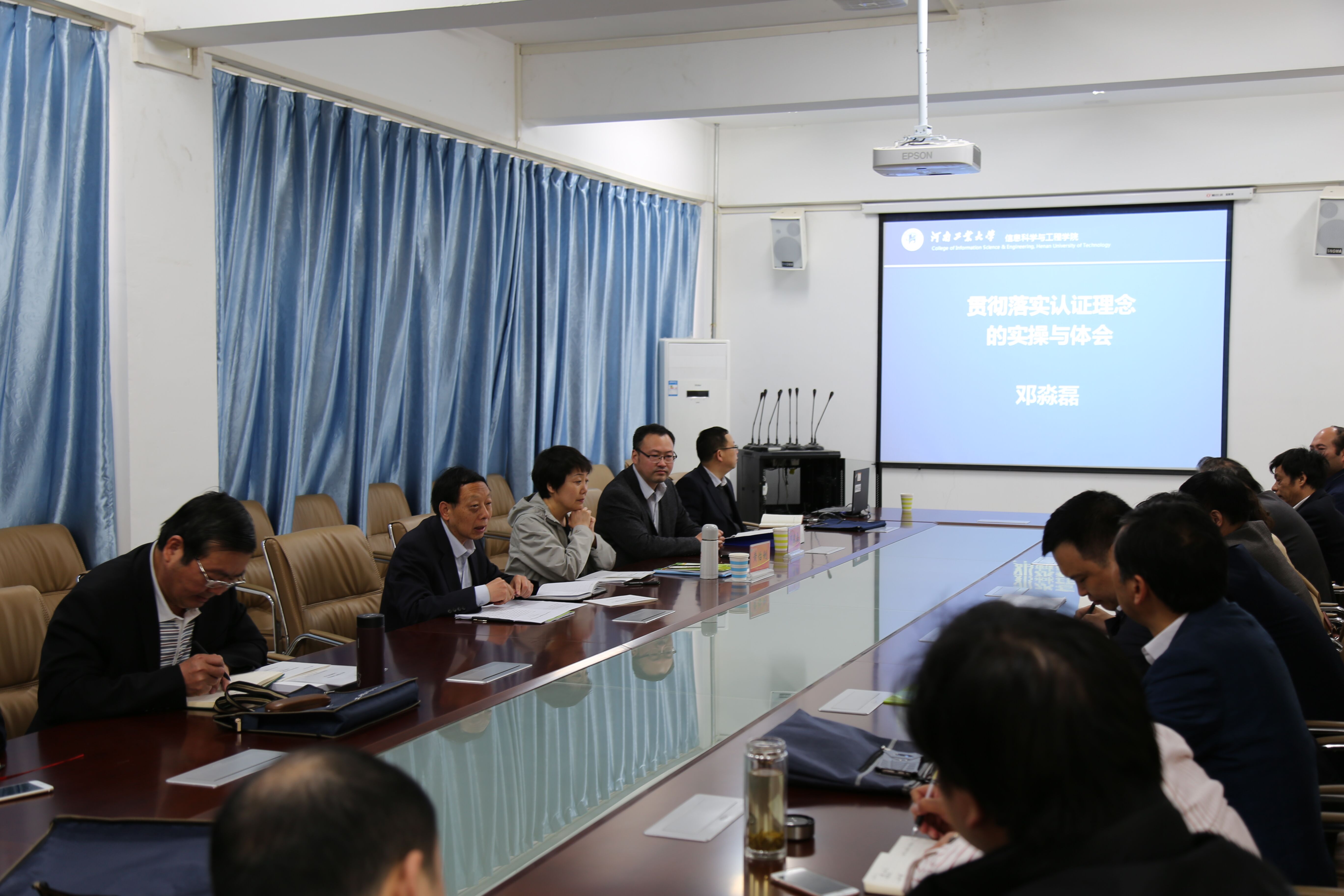 报告会上,邓淼磊教授以“贯彻落实认证理念的实操与体会”为主题,结合河南工业大学开展工程教育专业认证工作的具体做法,从认证工作中的主要组织保障措施、具体工作关键点、主要成效及体会三个方面展开,向与会人员进行了全面详细的讲解和材料展示。报告会后,各单位根据自评报告的撰写、支撑材料的准备等问题,与邓淼磊教授进行了讨论交流。