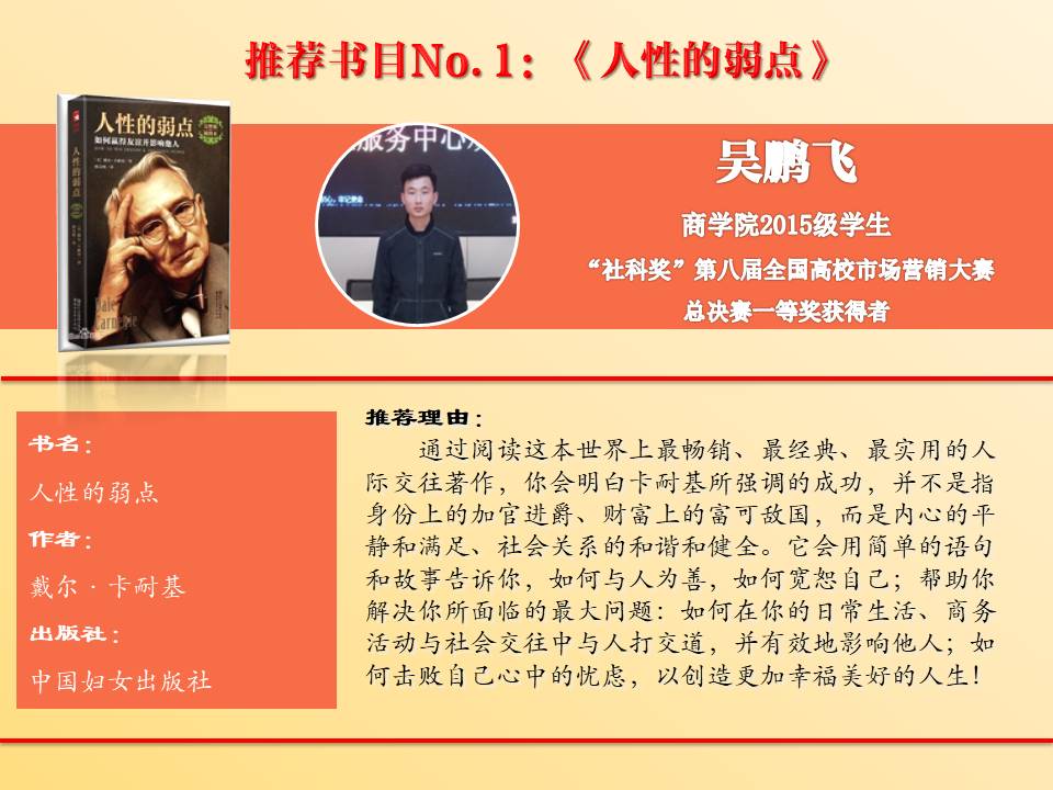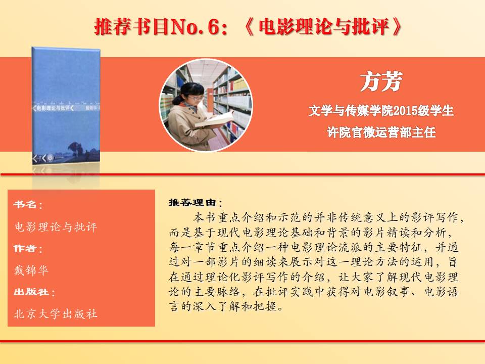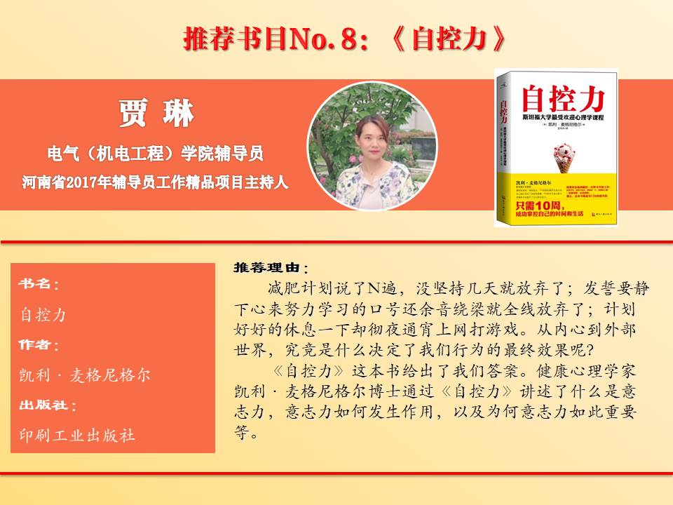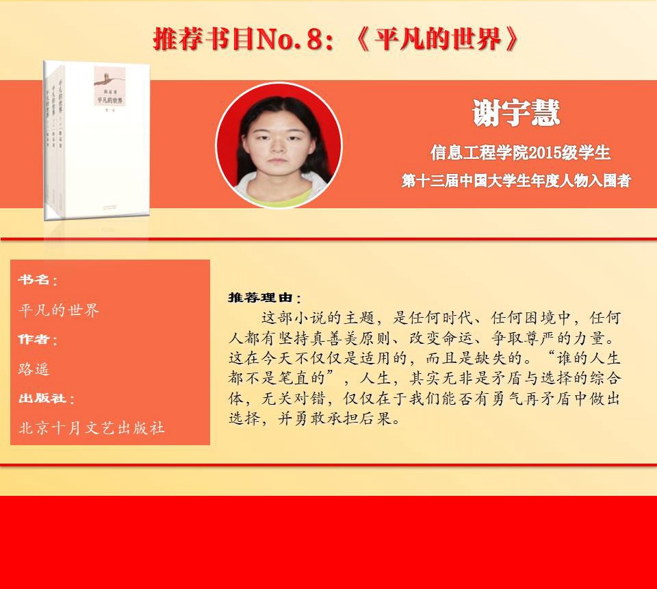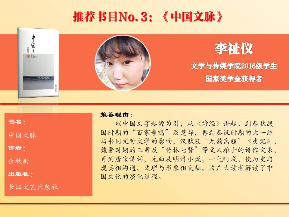 【编者按】为进一步激发全校师生爱读书、会读书、读好书的浓厚兴趣,努力营造书香校园的良好氛围,校党委宣传部(新闻中心)今年继续策划推出荐书专题活动。本期“师长荐书”和“学长学姐荐书”专题活动,特别邀请8位教师和8位同学精心推荐图书16本,在学校官方网站、官微等平台同步推送,敬请关注。