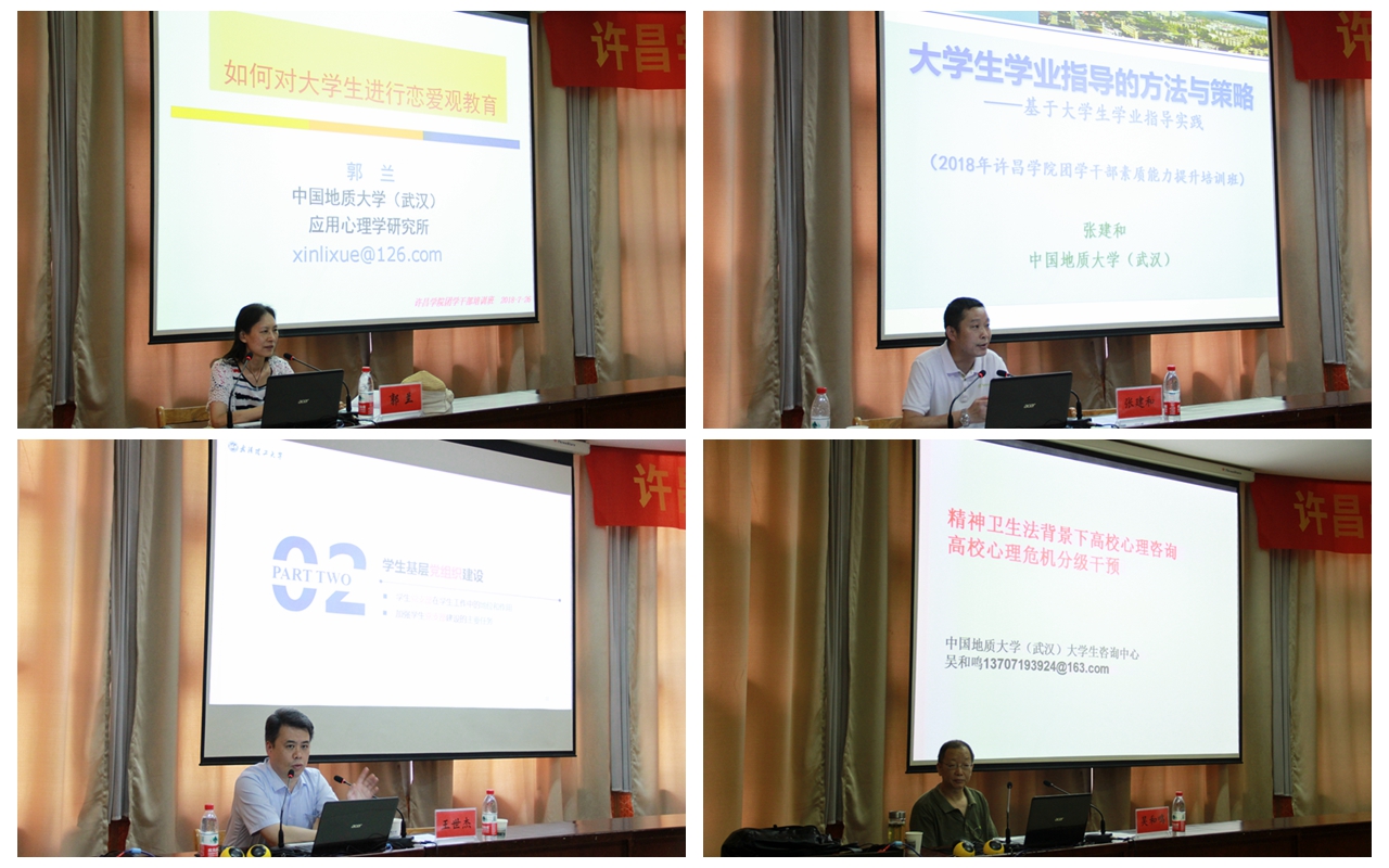 本次培训班根据《高等学校辅导员职业能力标准(暂行)》并结合永利集团3044官网欢迎您团学工作实际,邀请了中国地质大学(武汉)党委副书记王林清教授、中国地质大学(武汉)副校长傅安洲教授、中南财经政法大学党委副书记万清祥教授、中国地质大学党委常委、组织部部长储祖旺教授、中国地质大学原党委书记郝翔教授等10位湖北省知名思想政治工作专家为全体学员作了专题辅导报告。本次培训内容包括四个模块,一是辅导员角色认知与岗位特点,包括角色定位、角色价值与职业定向发展等;二是辅导员工作内容与方式方法,包括大学生党团组织建设与班级建设、恋爱观教育方法、大学生心理健康教育与危机识别处理、学业指导的方法和策略、大学生安全教育管理和突发事件处置、高校资助育人体系构建与实施等;三是辅导员工作对象及研究方法,包括当前大学生思想状况分析与调查方法、高校学生事务管理体系与方法创新等;四是辅导员工作环境解读,包括基于高等教育发展的我国学生工作变革、当前高校思想政治教育面临的挑战与对策。培训期间共开展了11场专题辅导报告。