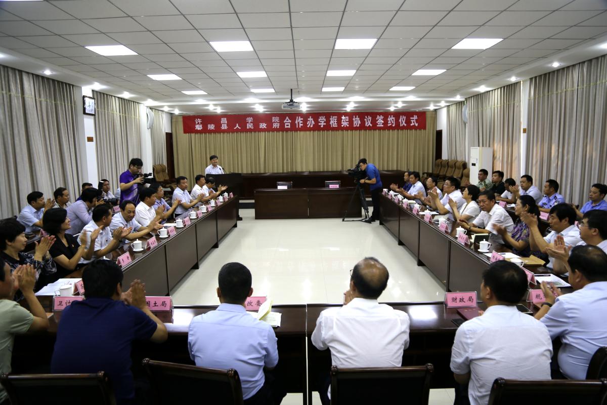 9月7日上午,永利官网与鄢陵县人民政府合作办学框架协议签约仪式在鄢陵县政府会议室举行。校党委书记闫纪建、院长赵继红、副院长赵正风、副院长崔斌,鄢陵县委书记尹二军及四大班子领导等出席签约仪式。永利官网党政办、教务处、财务处、发展规划处、校地合作办公室、基建处等职能部门负责人,陈化店镇党政正职和县教育、财政、发改、规划、国土等部门负责人参加签约仪式。仪式由鄢陵县委常委、常务副县长韩宏涛主持。