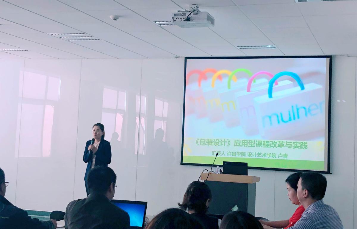 卢青老师分享的题目是《包装设计应用型课程改革与实践》,分为四个方面进行阐述:课程定位、课程设计、课程实施和课程评价。她结合《包装设计》课程的课改经验,介绍了应用型课程的教学目标应该从以掌握知识为目标转为以能力培养为目标,课堂教学应该从“以教师为中心”转为“以学生为中心”,并以工作坊的形式,现场展示了基于包装设计项目、团队合作、分组研讨的授课形式,以实际行动阐述了“以学生为中心”的新型教学方法。