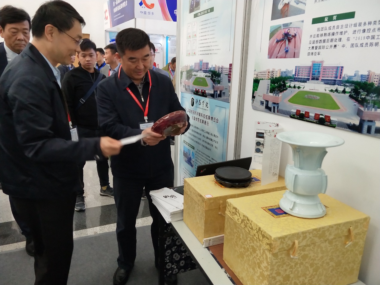 科技成果展示厅设在新乡市平原博物院,主要展示了我省高校、院所、企业的最新科技成果。永利官网经过严格筛选,最终选取工业机器人协同创新中心的短传动链精密减速器、清洁化工协同创新中心的富氢水发生器、超硬材料及制品协同创新中心的超细预合金粉、以及新型钧瓷釉料产学研合作基地的钧瓷精品作为永利官网代表参展。展会期间,河南省教育厅副厅长刁玉华专程来到永利官网展位前,详细了解了永利官网近年来取得的科技成果,并对永利官网在科学技术研发和科技成果转化方面取得的成绩给予了充分肯定,鼓励永利官网科技工作者多研发成果,积极为地方社会发展做出更大的贡献。