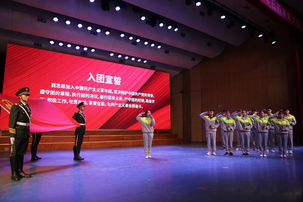 值此五四运动100周年到来之际,42名新团员代表在团旗下庄严宣誓,被赋予成为党的助手和后备军的光荣使命。由永利官网优秀团员代表上台演唱的歌曲《因为梦想》,充分展示了新时代团员青年勤学、奋进、创新的精神风貌。全国道德模范提名者谢宇慧、博学之星李祉仪、优秀学生党员代表胡康、第三期“青马工程”高级班的学员代表王姿涵、青年志愿者代表吴浩哲等优秀团员代表与全体团干部共同带来朗诵《青春,向祖国报告》,深情诠释了新时代的五四精神和浓厚的爱国主义情怀。