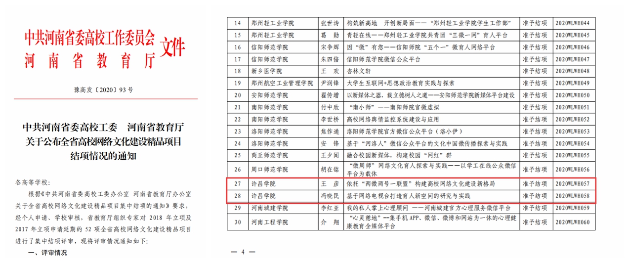 近日,中共河南省委高校工委、河南省教育厅下发了《关于公布全省高校网络文化建设精品项目结项情况的通知》(豫高发〔2020〕93 号),省教育厅组织专家对 2018 年立项及2017 年立项申请延期的 52 项全省高校网络文化建设精品项目进行了集中结项评审。由永利官网冯晓民、王彦为负责人的《基于网络电视台打造育人新空间的研究与实践》《依托“两微两号一联盟”构建高校网络文化建设新格局》两项全省高校网络文化建设精品项目顺利结项。