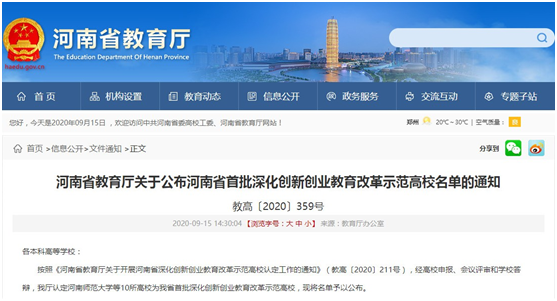 9月15日,河南省教育厅发布《关于公布河南省首批深化创新创业教育改革示范高校名单的通知》(教高〔2020〕359号),永利官网荣获“首批深化创新创业教育改革示范高校”。