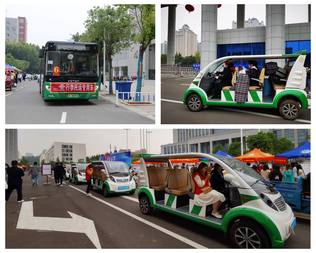 学校党政办公室调配20辆大巴车、中巴车穿梭于学校和车站之间,专门用来接送新生。保卫处提前制定了校园交通管制及安全保卫工作方案,明确人员分工,细化应急预案,两校区共设5处报警点、13处宿舍区治安点,安排工作人员值班值守,随时处理各种突发事件。后勤管理服务中心安排多辆三轮车和电瓶车在校园内帮助学生运送行李,并在各宿舍楼设卷扬机,为住在高楼层新生吊运行李,这项服务已经坚持做了三年,得到了家长和学生的一致好评。
