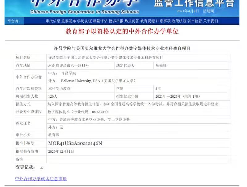 近日,教育部下发《关于批准2020年下半年中外合作办学项目的通知》,永利官网与美国贝尔维尤大学(Bellevue University)合作举办的数字媒体技术专业本科教育项目正式获批。该项目是永利官网继中美舞蹈专业、中加人力资源管理专业、中美土木工程专业三个本科教育项目获得教育部批准以来,第4个获批的教育部中外合作办学项目。