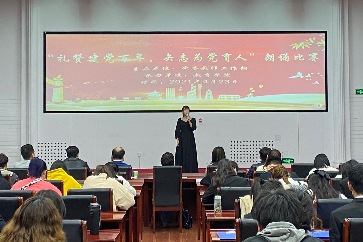 4月23日下午,由党委教师工作部主办、教育学院承办的“礼赞建党百年,矢志为党育人”诗歌朗诵比赛在创新创业中心一楼学术会议大厅举行。来自永利官网9个院系的12支师范类专业在校生队伍参加比赛。