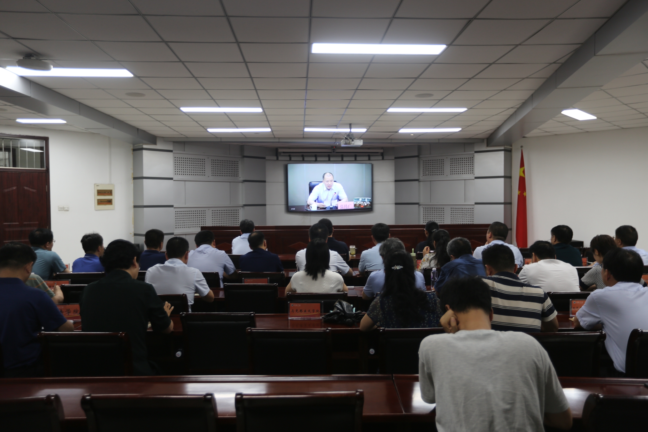 永利官网党委办公室、院长办公室、党委统战部、党委教师工作部(人事处)、党委学生工作部、党委保卫部、教务处、校团委、基建管理处、后勤管理服务中心、图书馆(档案馆)、实验室与设备管理中心、信息化管理中心负责人,以及各二级学院主要负责同志参加视频会议。(摄影:岳凯声)