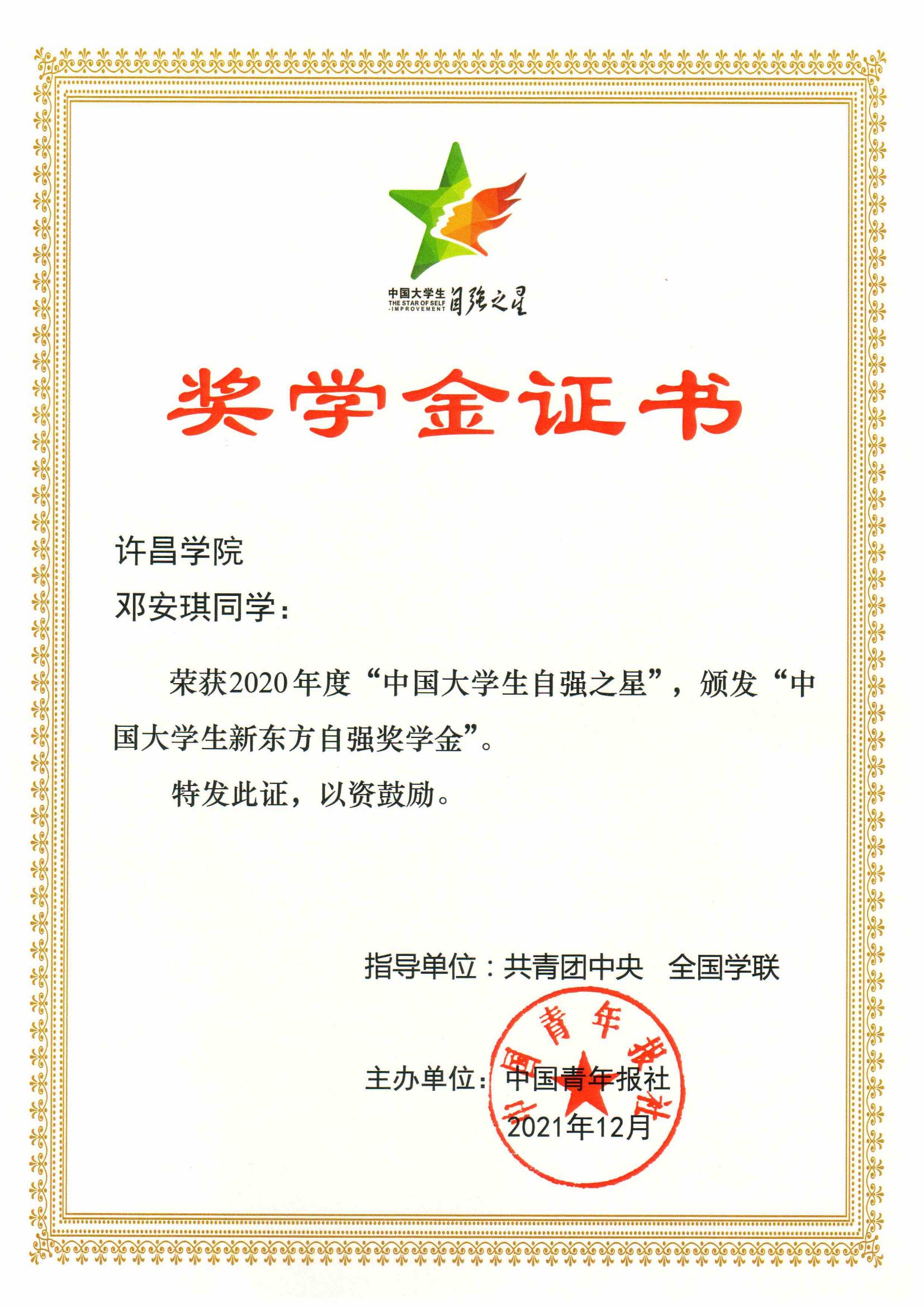 近日,由共青团中央、全国学联指导,中国青年报社主办的2020年度寻访“中国大学生自强之星”活动评选结果正式揭晓,永利官网文史与传媒学院邓安琪同学,经学校推荐、省级初评、全国评审等环节,荣获“中国大学生自强之星”称号,并获得“中国大学生新东方自强奖学金”。