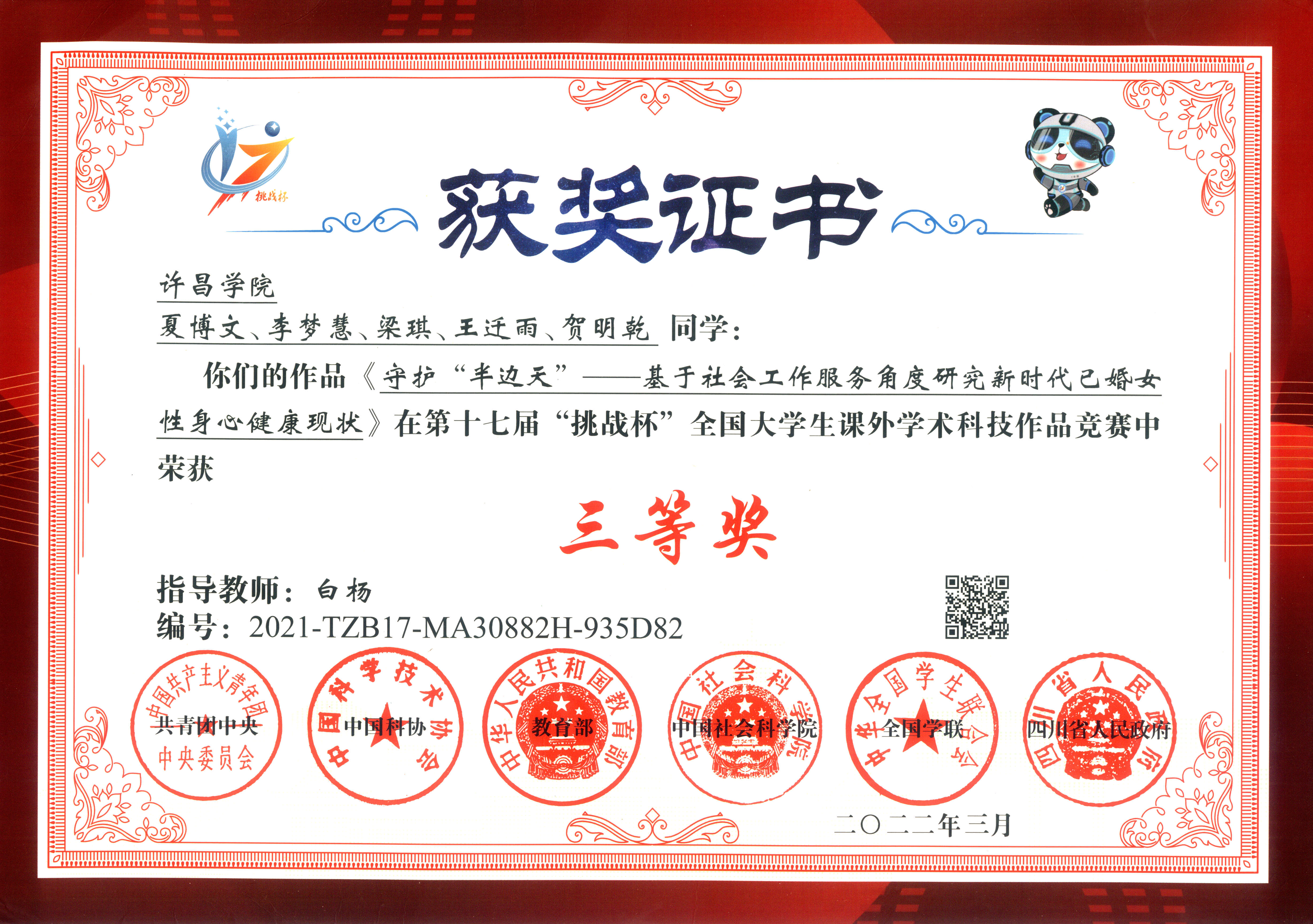 近日,由共青团中央、中国科协、教育部、中国社科院、全国学联和四川省人民政府共同主办的第十七届“挑战杯”全国大学生课外学术科技作品竞赛终审决赛在四川大学落下帷幕。由校团委白杨老师指导,夏博文、李梦慧等同学组成的项目团队撰写的作品《守护“半边天”——基于社会工作服务角度研究新时代已婚女性身心健康现状》作为河南省参赛项目荣获全国三等奖。