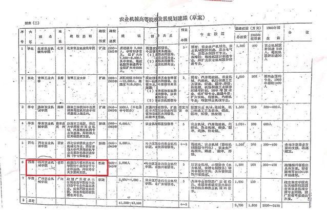 1960-1963年为建校期间,建议四川省从现有高等院校中选择若干专业作为基础,并取得有关方面支持;学校规模5000人,主要为西南大区服务的农业机械学院,由四川省领导; 修业年限为5年; 专业设置以农业机械、小型给排水机械、农业电站设备等为学校发展的方向,具体安排请四川省提出意见: 基本建设投资1500 万人民币,1960 年投资200 万人民币; 1960 年招生300~400 人,建议四川省提出具体方案,若有困难,可以1961年建校。”