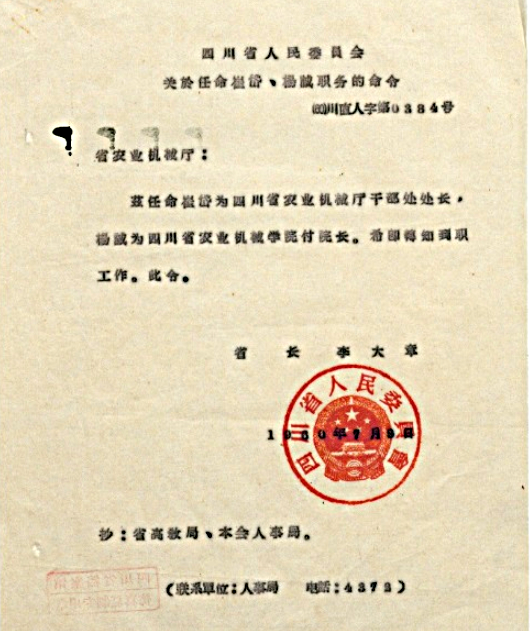【四川省人民委员会(60)川直人字第0384号】:任命杨诚为四川农业机械学院的副院长
