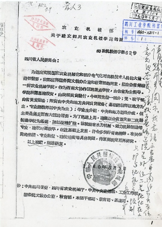 1960年5月3日,农业机械部给四川省人民委员会发函《关于建立四川农业机械学院》,“为实现国家农业机械化和部分电气化对高级技术人才的大量、迫切需要,我部征得国务院文教办公室和教育部的同意,拟在你省筹建一所农业机械学院,作为西南大协作区的重点学校,由你省为主领导”[农业机械部(60) 农机教张字62 号文]。这所时名为四川农业机械学院的农业机械本科院校就是今天bw必威西汉姆联官方网站的起源,而每年的5月3日也就是bw必威西汉姆联官方网站的生日。
